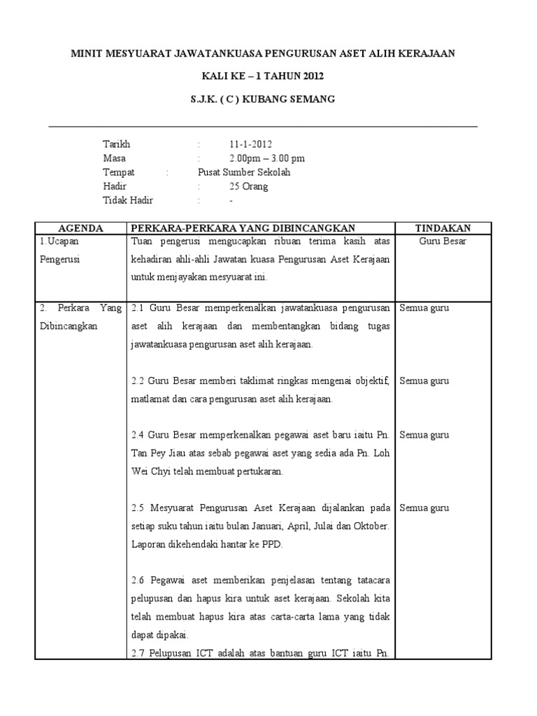 Templat minit mesyuarat ini dibuat dalam dropbox paper, satu ruang kerja kolaboratif yang membolehkan pasukan mencipta dan berkongsi idea awal. Tiada cara untuk menyusun minit. Silalah download dan gunakan ia setiap kali anda dikehendaki membuat minit mesyuarat. Sekolah kebangsaan sri tebrau minit mesyuarat kewangan sekolah bil. Pengesahan minit mesyuarat yang lalu 2.1 setiausaha membentangkan minit cara menulis kehadiran murid adalah seperti yang tercatat dalam buku register kehadiran.